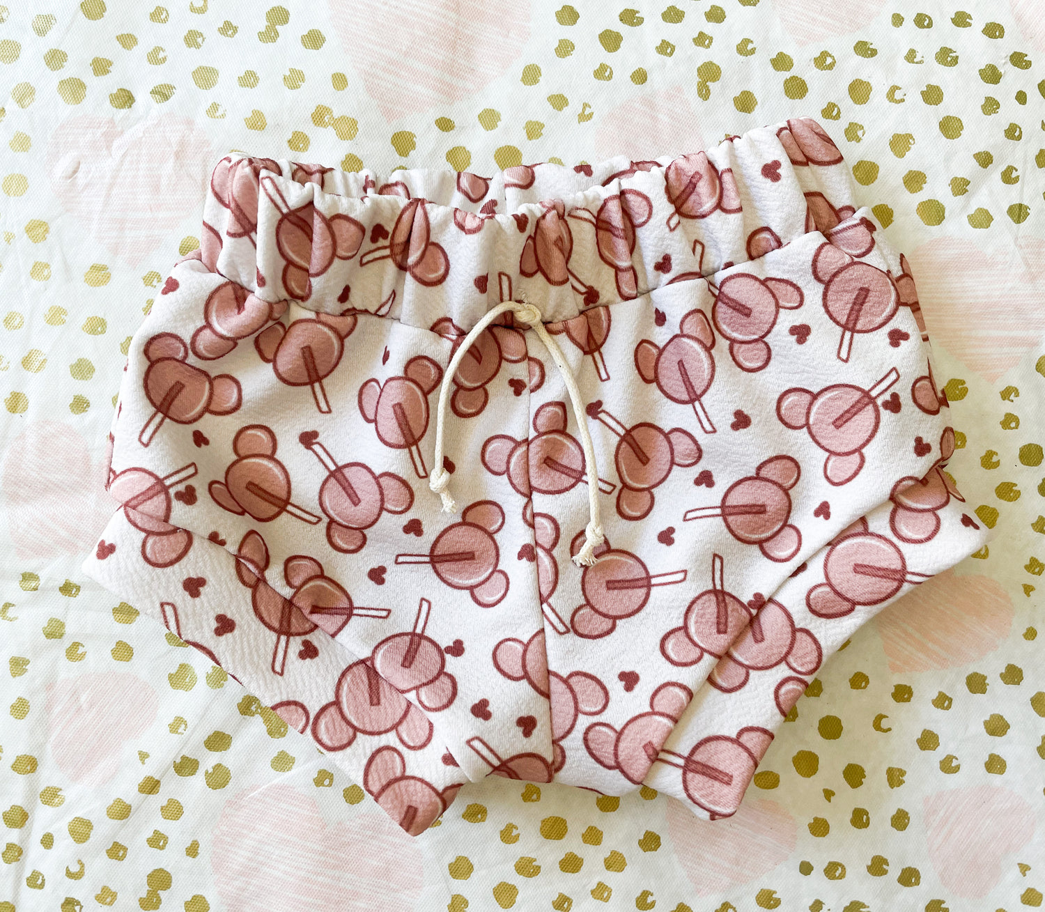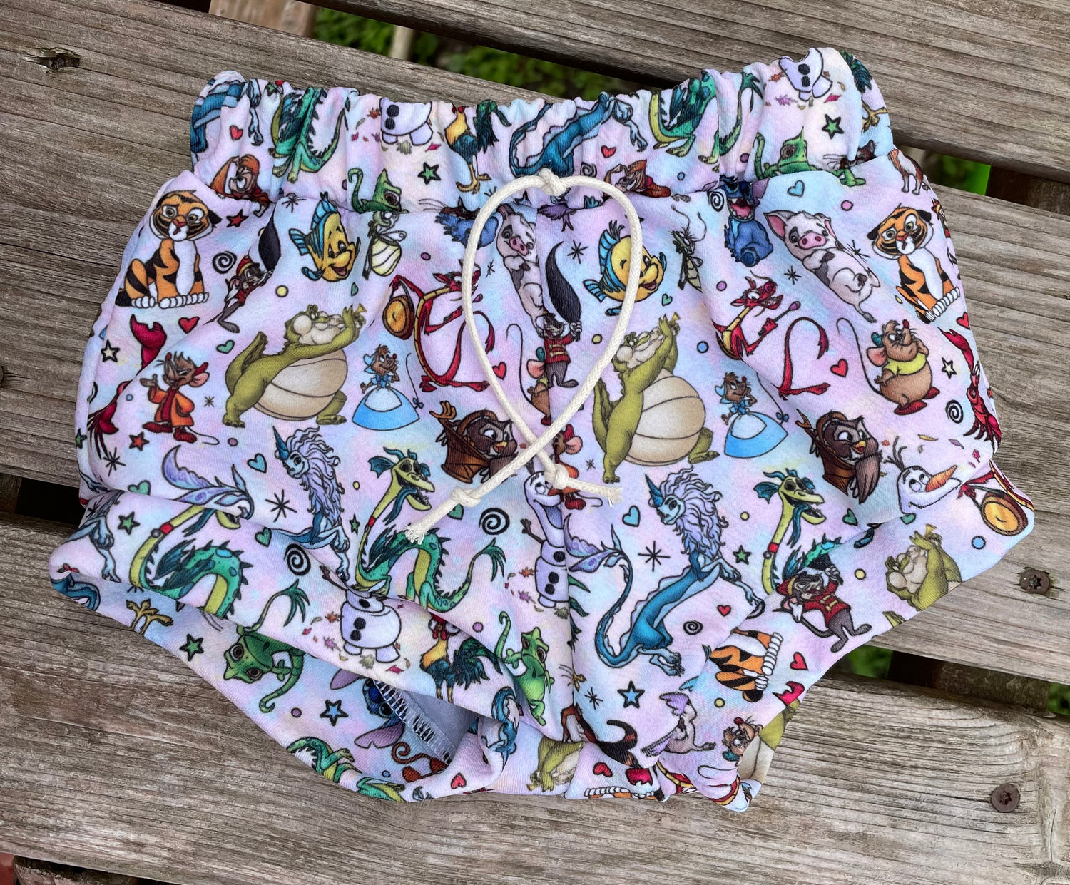 Elastic waistband shorts. With a fake draw string and cuffed legs.